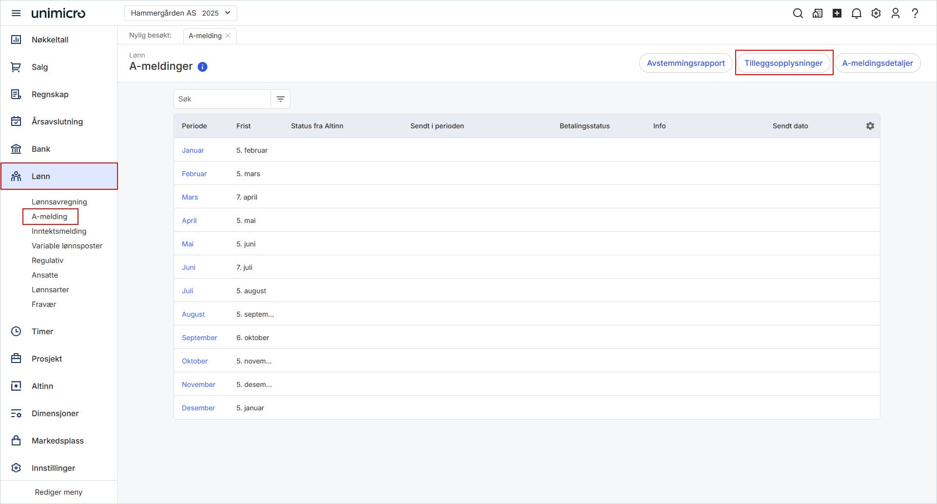 1. Gå til A-melding i venstremenyen og velg Tilleggsopplysninger.