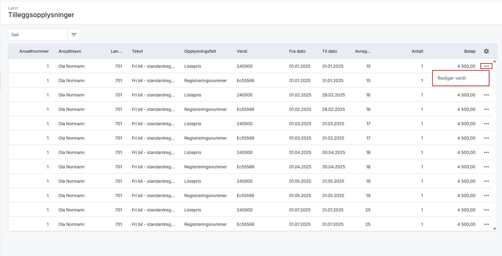 Tilleggsopplysninger benyttes på lønnsarter hvor det er satt opp tilleggsinformasjon pakke under A-meldingsinformasjon på lønnsarten. Tilleggsopplysninger kan legges til via en lønnsavregning eller via funksjonen Tilleggsopplysninger.
