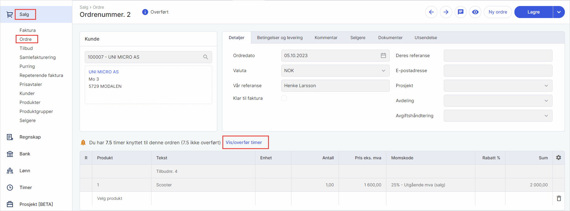 3. Gå til Salg i venstremenyen og velg Ordre. Hent frem ordren du skal overføre timene til. Du åpner ordren og trykker på Vis/overfør timer.