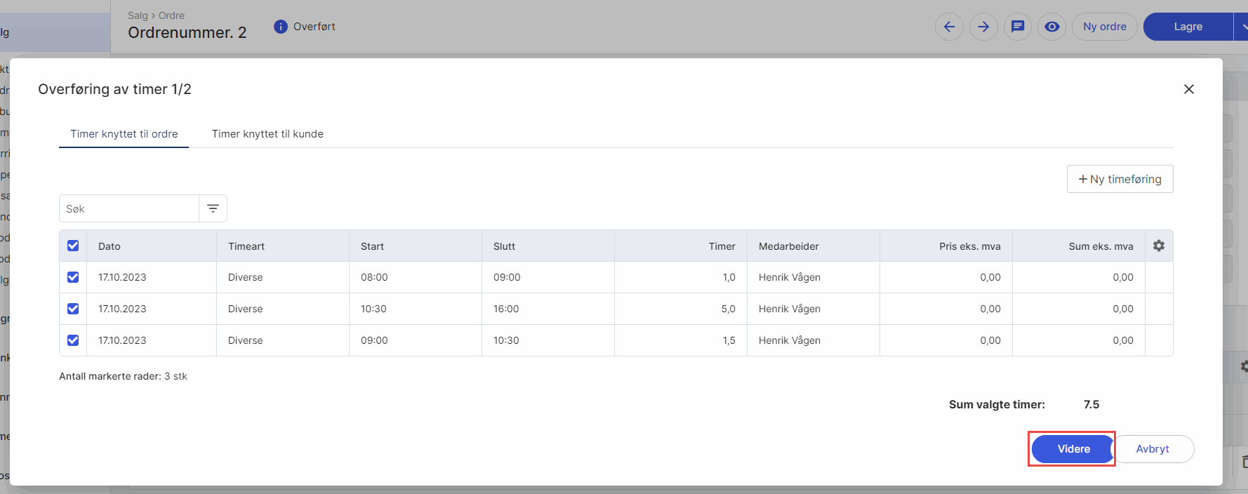 Tips: Du kan også benytte funksjonen Fakturering av timer for å overføre timer til ordre.