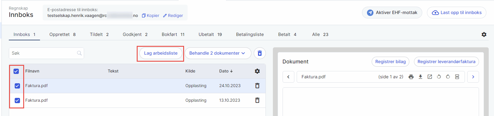 Marker to eller flere fakturaer i innboksen ved å krysse av i boksene ved siden av dem. Når du gjør dette, vil knappen Lag arbeidsliste vises. Klikk på denne knappen for å opprette en arbeidsliste med de markerte fakturaene.