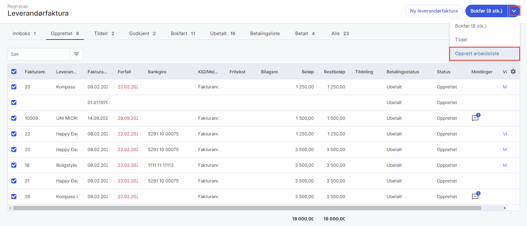 Leverandørfaktura-arbeidslisten i Unimicro er et verktøy som gir deg muligheten til å strukturere og administrere fakturaer på en effektiv måte.