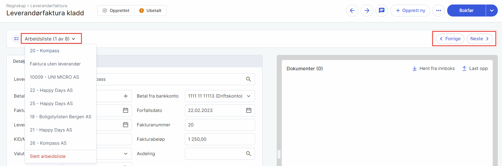Ved å aktivere e-postmottak, EHF-mottak og laste opp filer direkte til innboksen, får du en allsidig tilnærming til mottak av fakturaer. Deretter kan du dra nytte av Leverandørfaktura-arbeidslisten for å opprette arbeidslister, organisere filene i trinn eller stadier, og navigere sømløst mellom dem. Med muligheten til å legge til flere filer, tømme eller erstatte eksisterende arbeidslister, kan du opprettholde en strukturert og effektiv arbeidsflyt.
