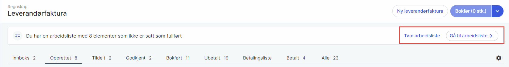 Hvis du forlater arbeidslisten, vil du senere finne et informasjonsbanner i oversiktsbildet for Leverandørfaktura som lar deg gå tilbake til listen. Du kan også tømme arbeidslisten ved å velge Tøm arbeidsliste. Dette fjerner alle filene fra arbeidslisten.