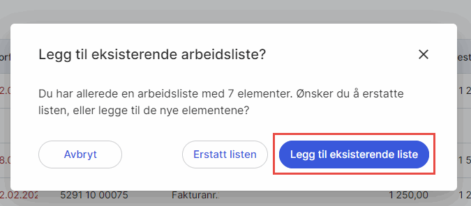 Du kan enkelt legge til flere filer i en allerede opprettet arbeidsliste ved å markere filene og velge Lag arbeidsliste. Dette gir deg muligheten til å legge til flere fakturaer i den eksisterende arbeidslisten. Hvis du ønsker det, kan du også erstatte den eksisterende arbeidslisten med de markerte filene.