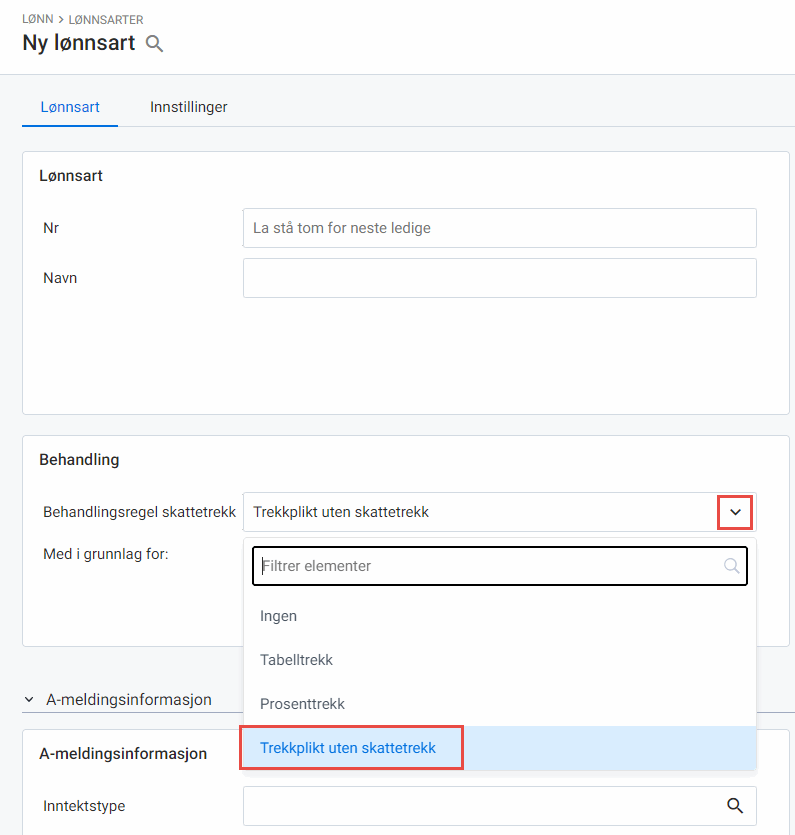 2. Lag en nøyaktig kopi av lønnsarten du bruker, men klikk på pilen for å velge Trekkplikt uten skattetrekk under behandling. På denne måten blir det innberettet som skattepliktig, slik at du unngår negativt skattetrekk på lønnsavregningen. Innberetningen skjer med skattetrekk i A-meldingen.