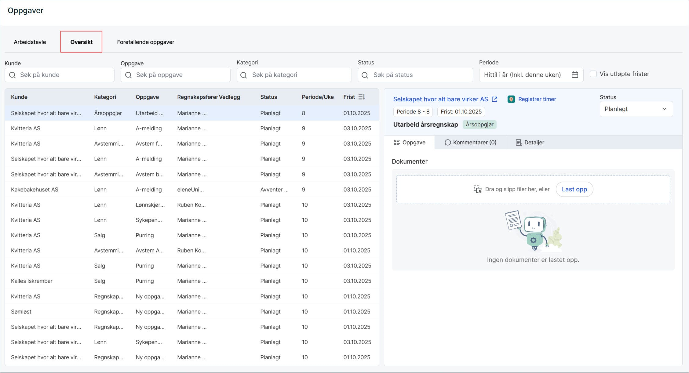 Her får du en samlet oversikt over alle oppgaver. Ved å klikke på en oppgave kan du se gjøremål, dokumentasjon, kommentarer og detaljer. Du kan filtere etter kunde, oppgave, kategori og/eller periode. På denne måten kan du se hvilke oppgaver som gjenstår på hvilke kunder, og hvem som står ansvarlig for å utføre oppgavene.