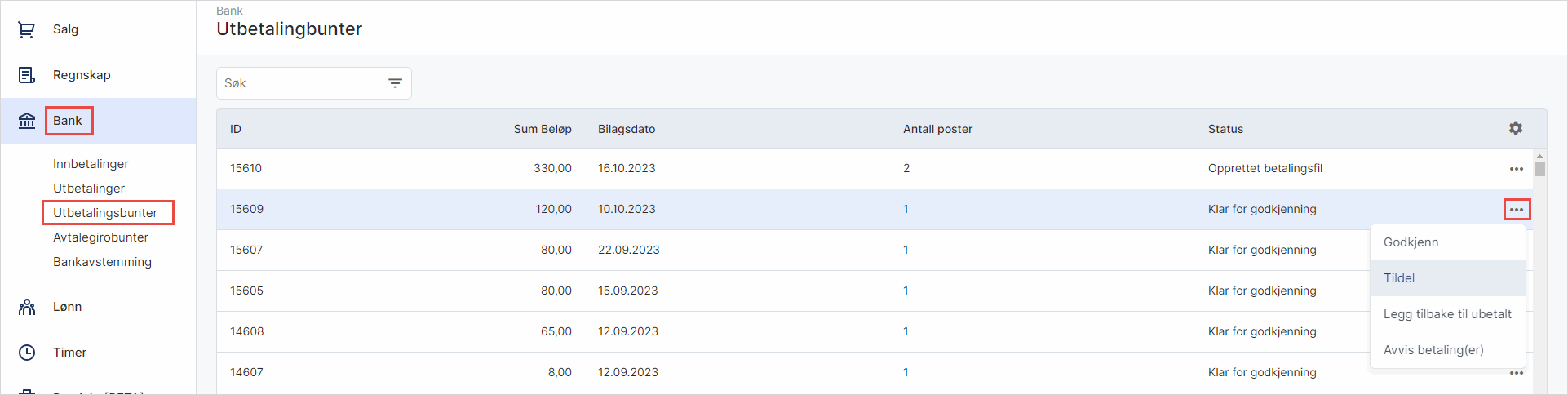 Gå til Bank i venstremenyen og velg Utbetalingsbunter. Her finner du en oversikt over alle opprettede utbetalingsbunter og deres status. Du kan også ettergodkjenne bunter hvis du bruker Regnskapsgodkjente Betalinger, eller tilbakestille bunter hvis det er nødvendig.
