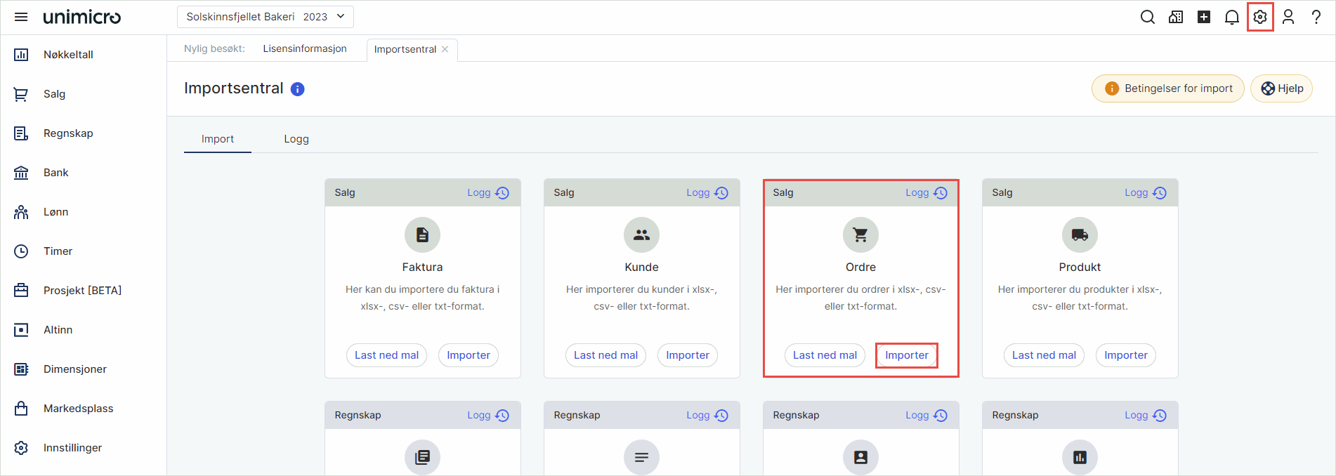 1. For å importere ordrene til ditt regnskapsbyrå i systemet, velger du byråets eget selskap/klient i nedtrekkslisten til venstre, går til Innstillinger i toppmenyen og velger Importsentral. Gå til Ordre og Importer.
