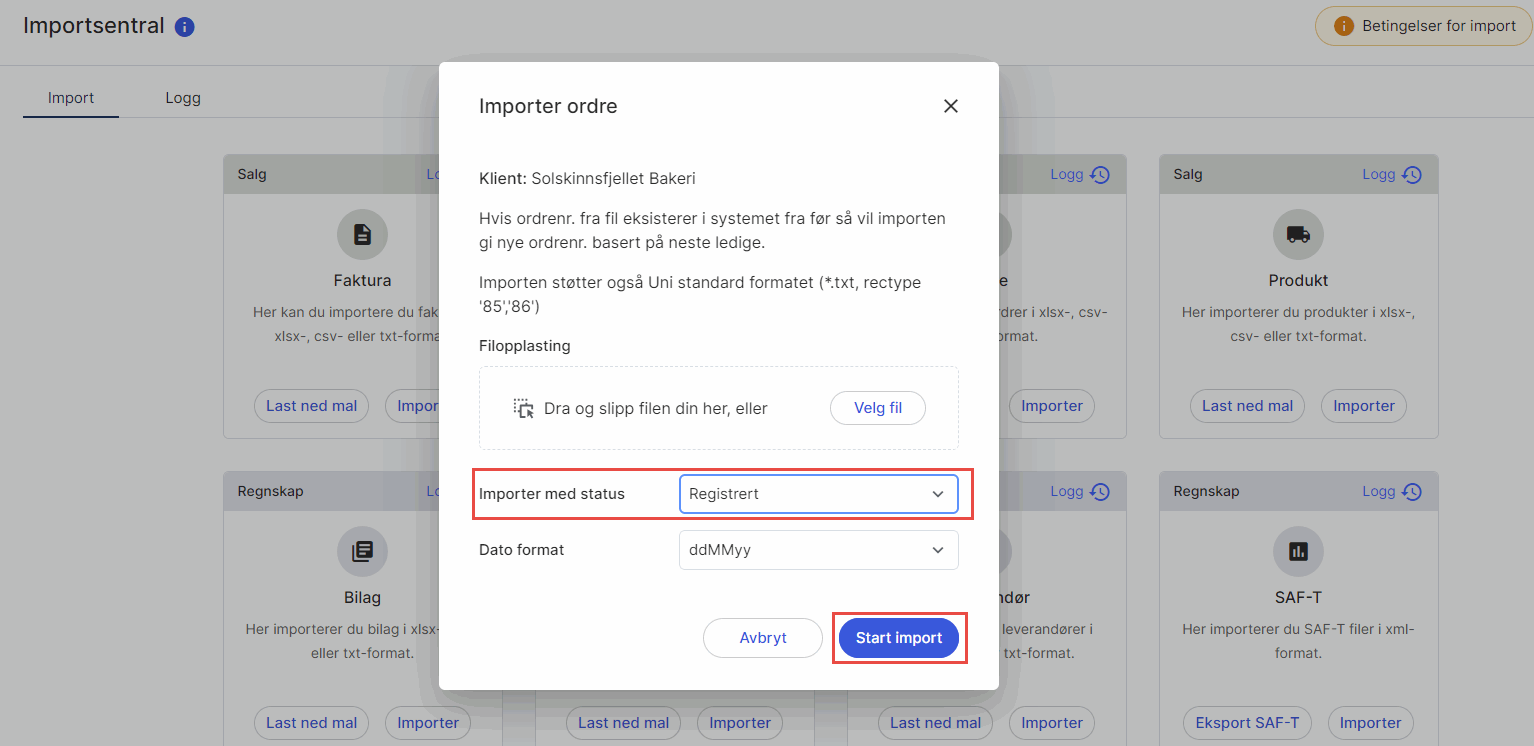 2. Last opp ordregrunnlaget. I feltet Importer med status velger du Registrert. Hvis du velger status Kladd vil det ikke være mulig å samlefakturere ordrene. Husk å angi det samme datoformatet som brukes i ordregrunnlaget (dd.mm.yyyy).