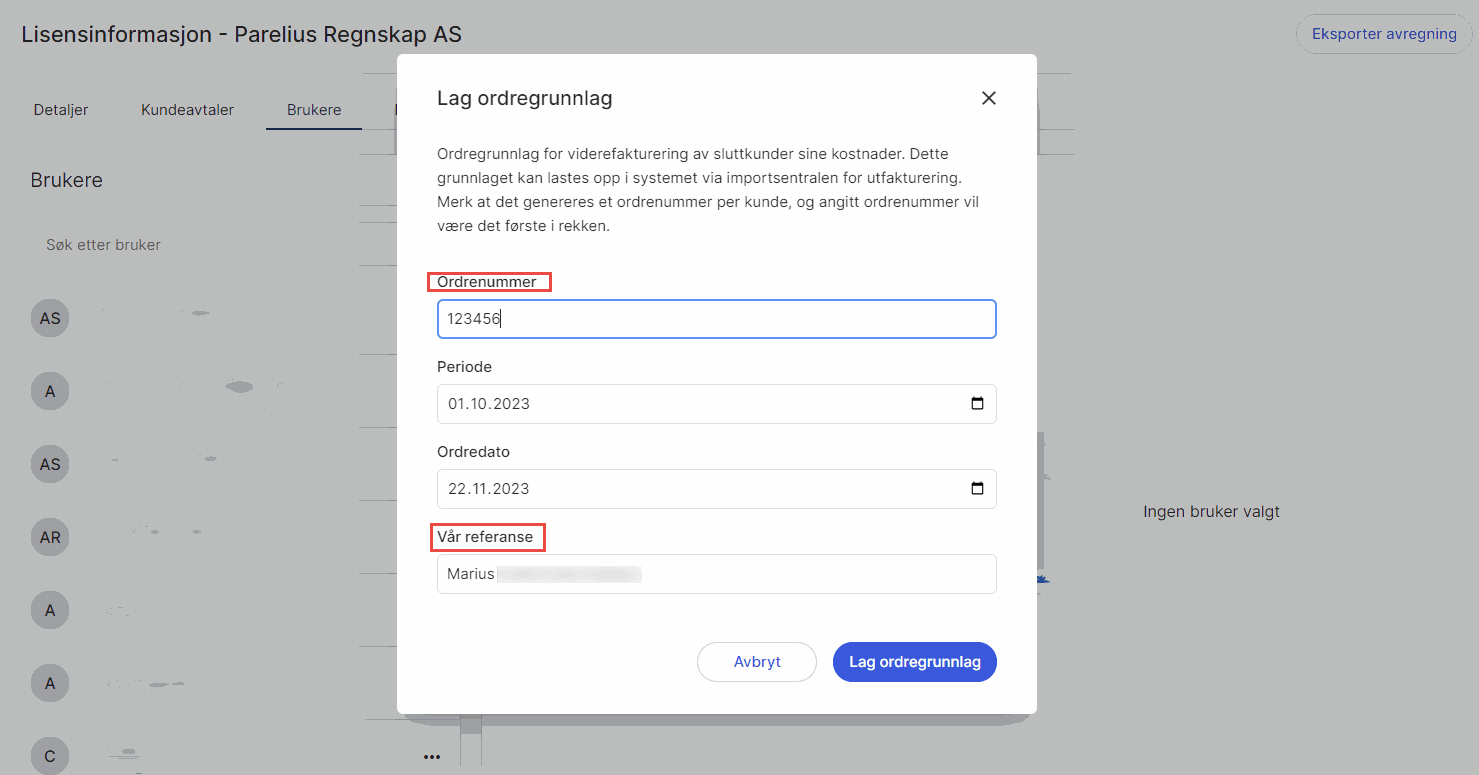 3. Under ordrenummer angir du nå det neste ordrenummeret i rekken (som du hentet fra salgsmodulen). Det blir generert ett ordrenummer for hver kundeavtale. I feltet Periode angir du måneden du vil lage ordregrunnlag for. Ordredato er datoen som vil ligge i ordren når grunnlaget importeres. Du må også fylle ut Vår referanse.