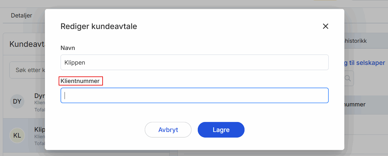 Legg inn reskontronummeret i feltet for Klientnummer. Dette vil sikre at eksporten av ordregrunnlaget inneholder klientnummer som samsvarer med klientnummer til hver enkelt kundeavtale, og at lisens- og transaksjonskostnader kan faktureres til riktig selskap. Ordregrunnlaget vil hente reskontronummeret til kundeavtalen, som inkluderer lisens- og transaksjonskostnadene til alle selskapene på kundeavtalen.