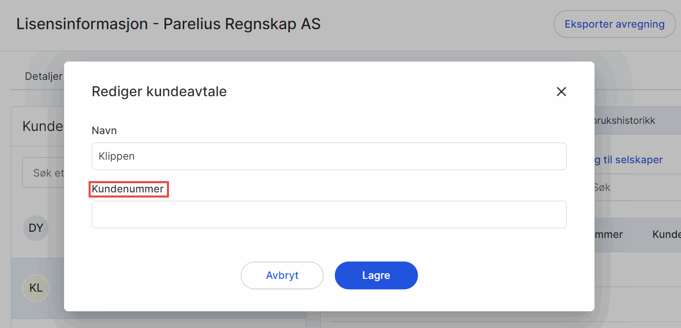 Legg inn reskontronummeret i feltet for Kundenummer. Dette vil sikre at eksporten av ordregrunnlaget inneholder kundenummer som samsvarer med kundenummeret til hver enkelt kundeavtale, og at lisens- og transaksjonskostnader kan faktureres til riktig selskap. Ordregrunnlaget vil hente reskontronummeret til kundeavtalen, som inkluderer lisens- og transaksjonskostnadene til alle selskapene på kundeavtalen.