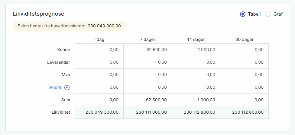 Likviditetsprognosen gir deg en oppdatert oversikt over bedriftens likviditet til enhver tid. Oversikten kan fremstilles tabellarisk eller som graf.